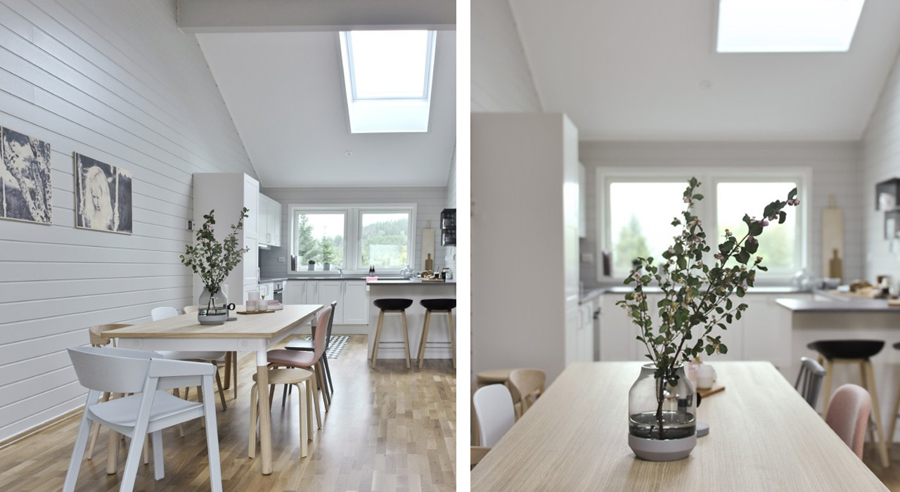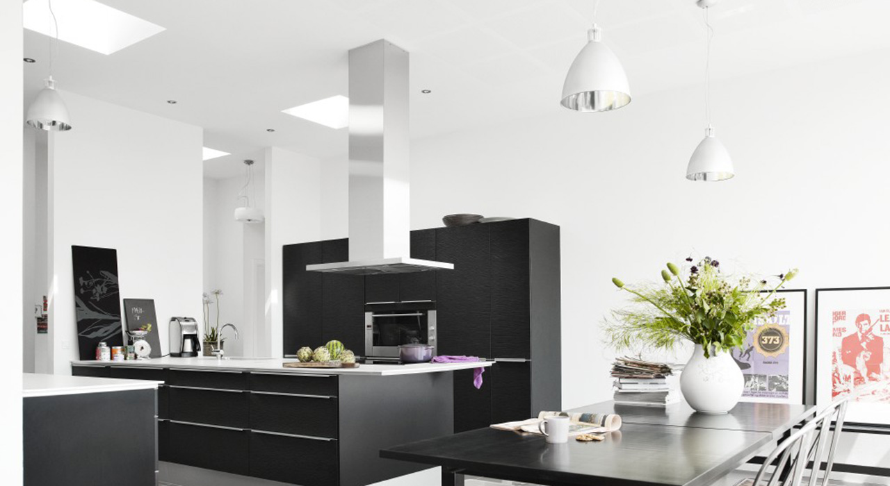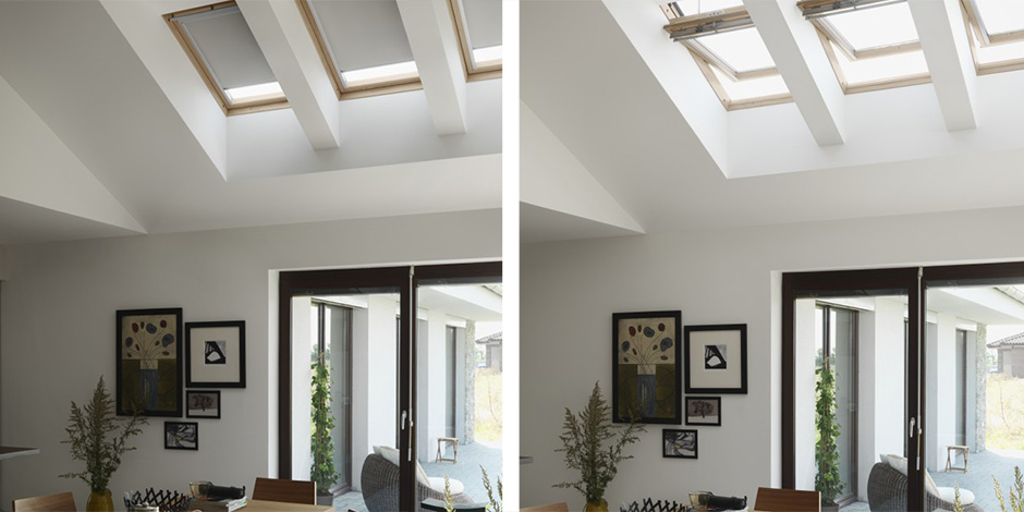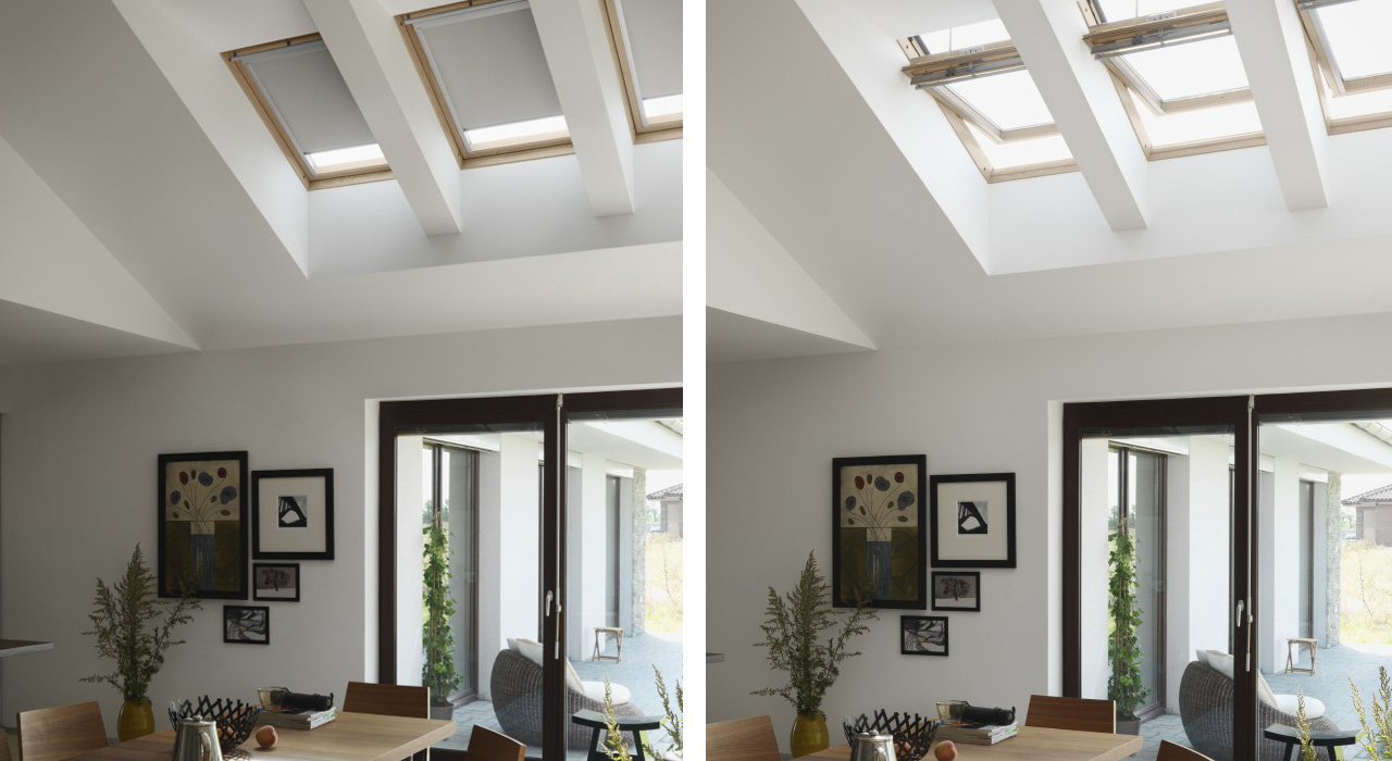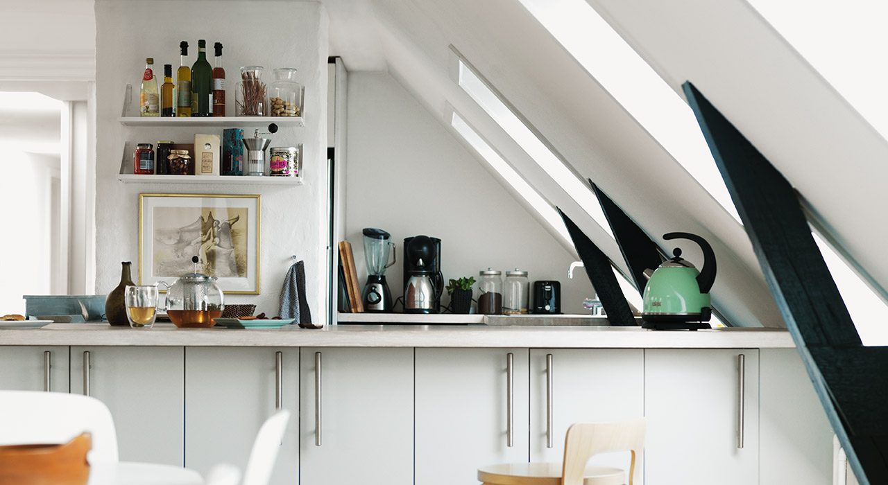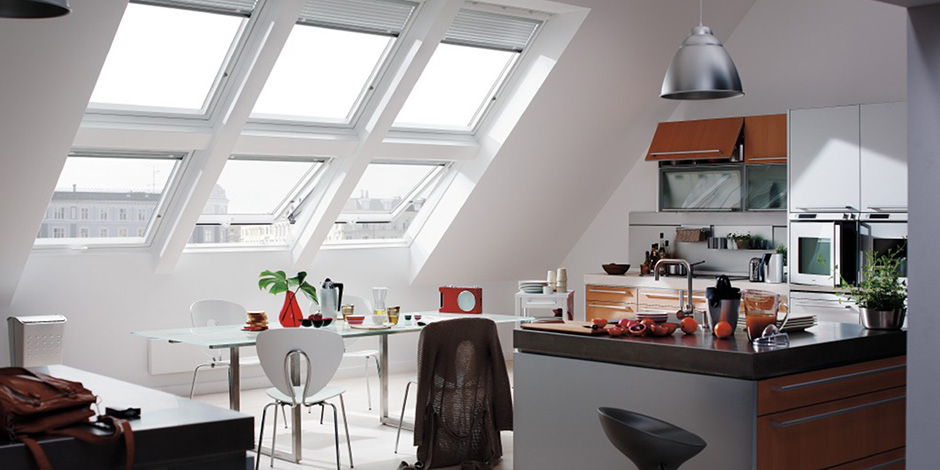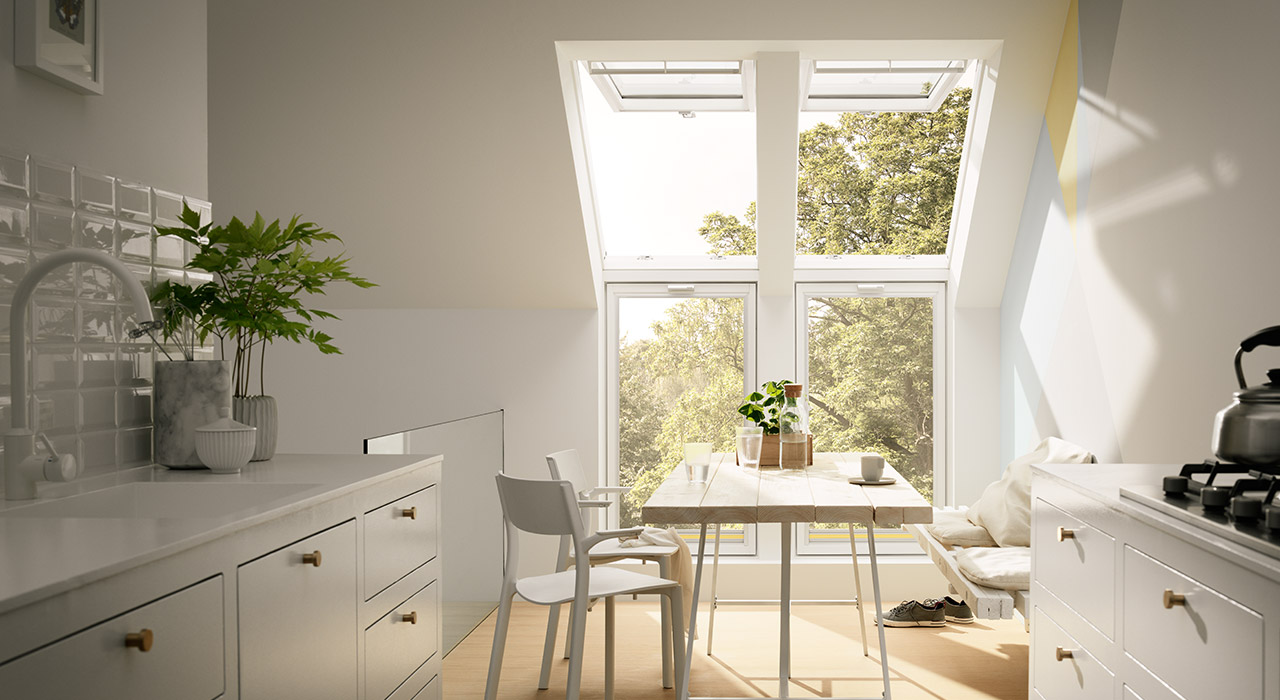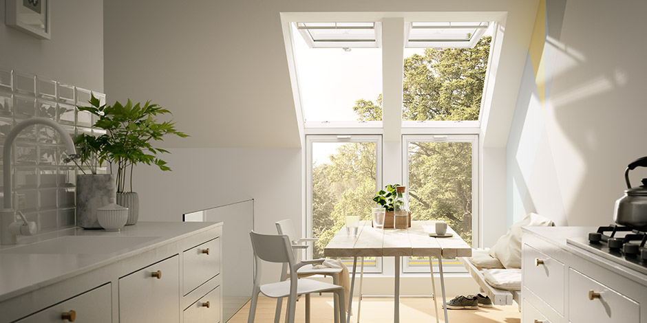 Placed high up in the ceiling, the VELUX INTEGRA® roof window provides abundant, even daylight to the entire kitchen. Whenever possible, we recommend placing roof windows above the working and dining areas to ensure the best possible light and ventilation where it is needed the most.