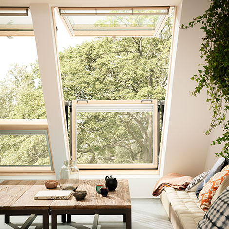 The VELUX CABRIO® balcony lets you enjoy natural light and great views while letting outside space flow into your interior. The window opens outwards on its top hinges to give you extra headroom and beautiful panoramic views.