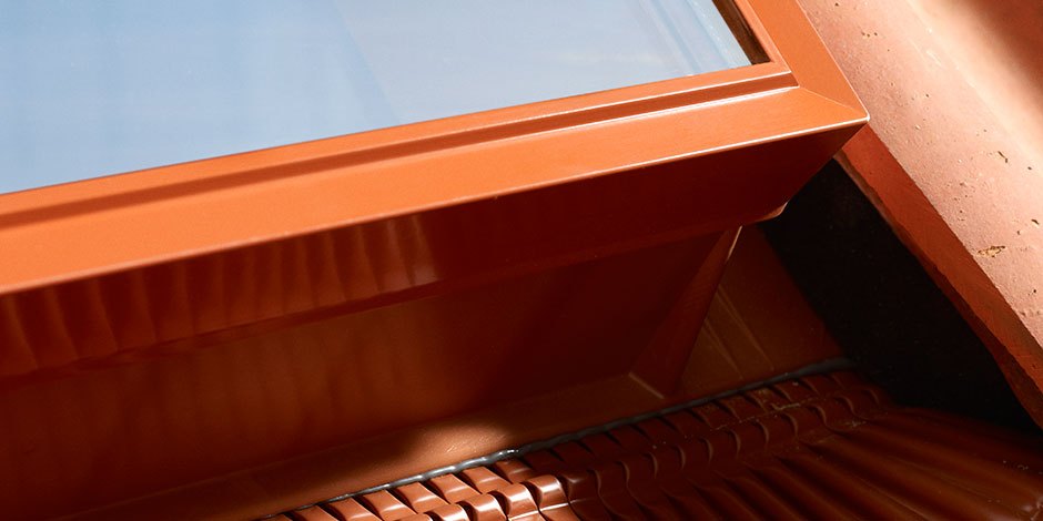 Integrated universal flashings for both flat and profiled roofing material up to 6 cm high. NB: Not for use with standing seam metal roofs. Available in black or brick red