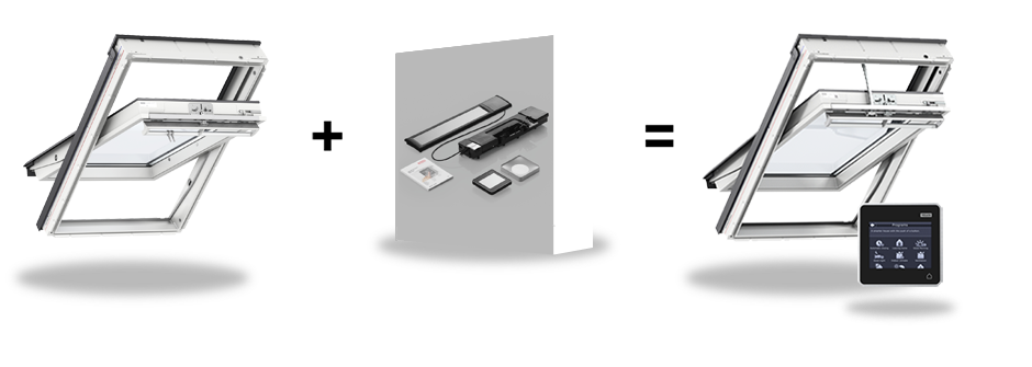 Solar-powered upgrade kit for one roof window Installs in less than 45 minutes No wiring necessary Complete with window opener, solar panel with battery and control pad Pre-defined programmes and scheduling available in the control pad Includes rain sensor, which closes the window automatically in the event of rain Functions even on north-facing roofs Buy solar upgrade kit