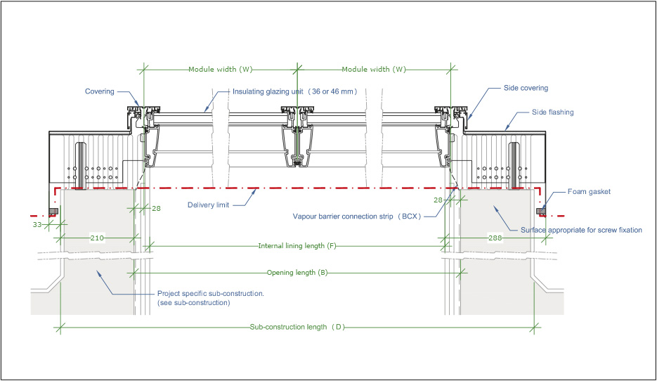 Longitudinal section For and illustration of the interface between the Modular Skylights and the sub-construction, download a 2D drawing of the longitudinal section. Download longituinal section