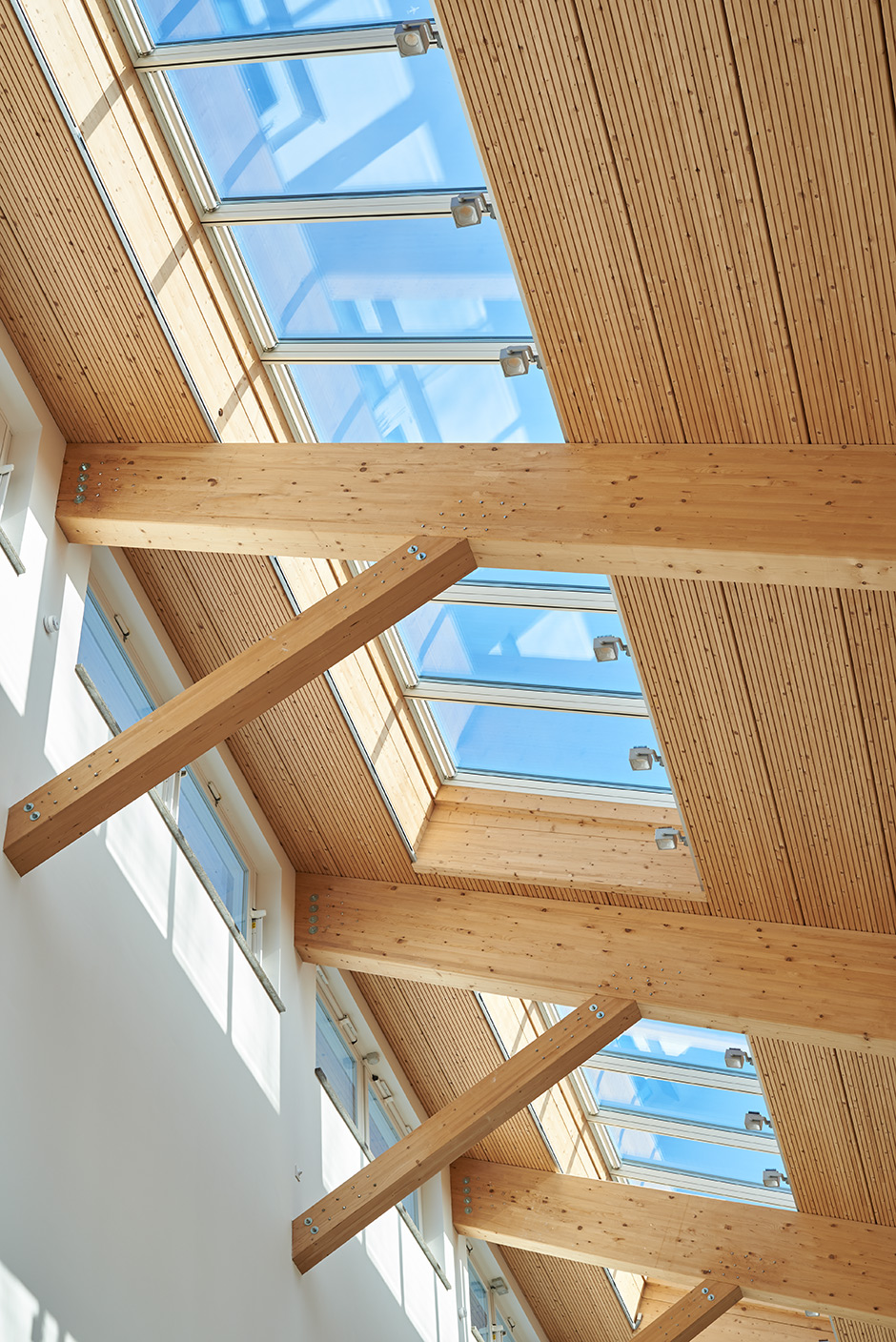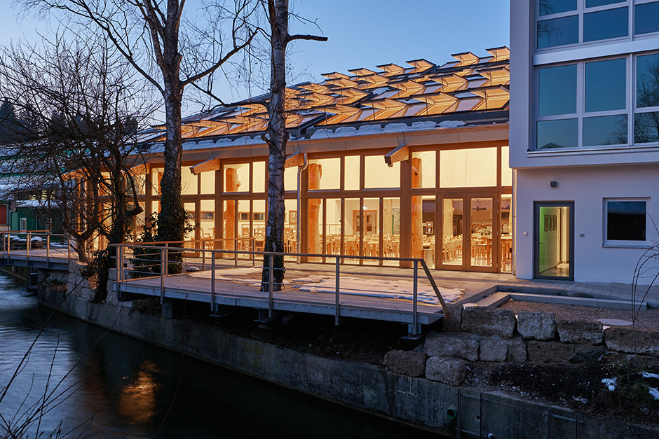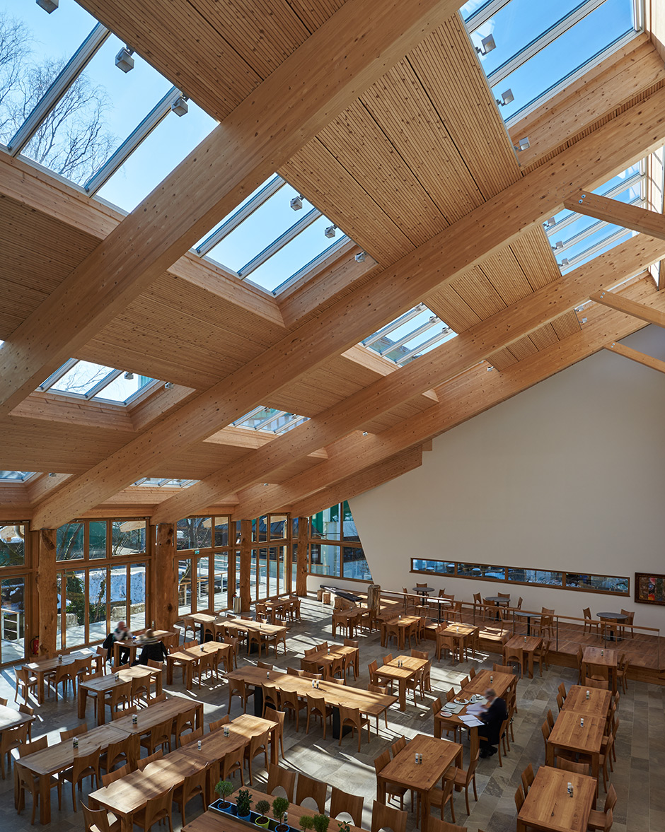 An old and somewhat worn out canteen was the direct reason for SALUS-Haus, a German manufacturer of natural health products, to construct a new extension with a brand new cafeteria for its 300 employees. The use of untreated wood and natural tiles reflects the company philosophy, as does the intrinsic transparency that is supported by several rows of VELUX longlights, adorning the pitched roof.