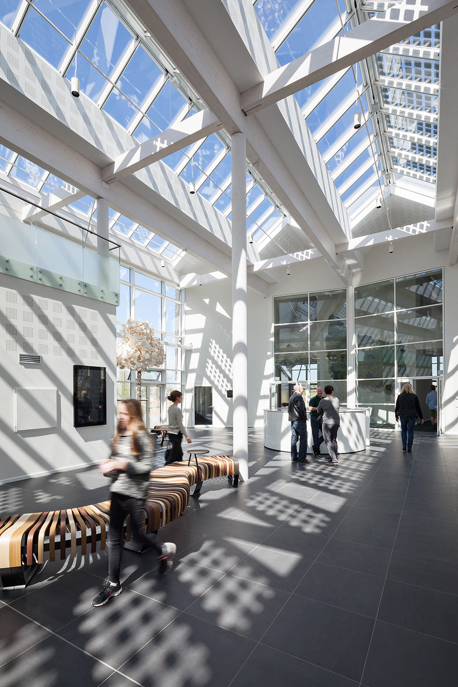 To ensure plenty of daylight and ventilation, a selection of VELUX ridgelight solutions were installed in the expansion, atrium and reception area. To underpin the sustainability principles some of the VELUX Modular Skylight modules are with built-in photovoltaic cells. Photovoltaic modules are designed to generate free electricity to the building and its users, creating a valuable supplement to the consumption of conventional power. Also, a large number of single VELUX roof windows and domes were introduced to ensure a pleasant indoor environment, mainly in hotel rooms, hallways and conference rooms.