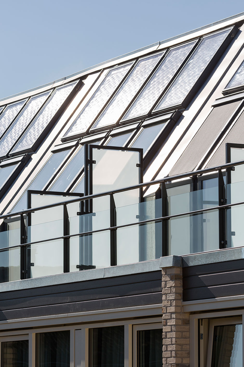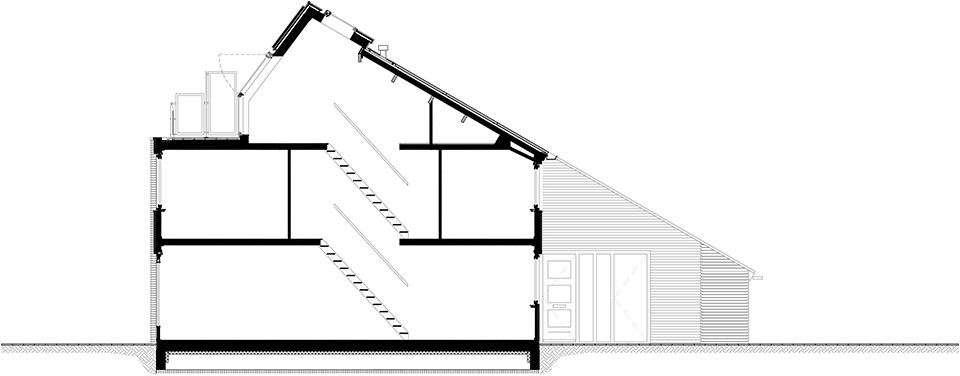 On the one hand, they provide horizontal cross-ventilation on the different floors; on the other, opening the roof windows on the top floor creates a vertical chimney effect around the open stairwell that channels stale air up from the lower floors and allows it to escape through the roof.