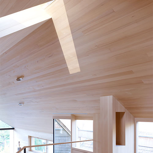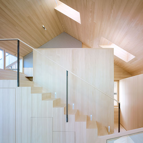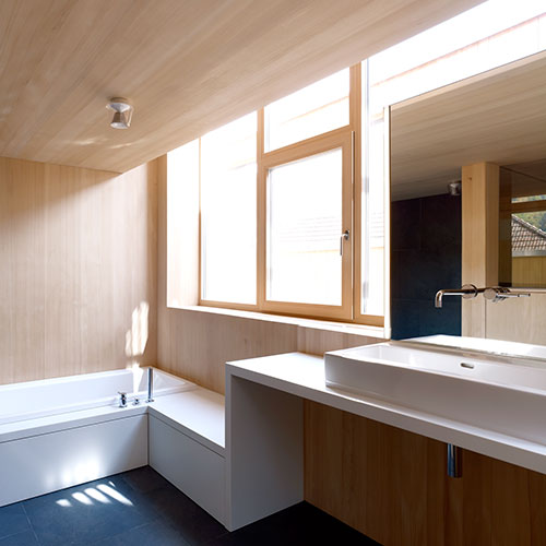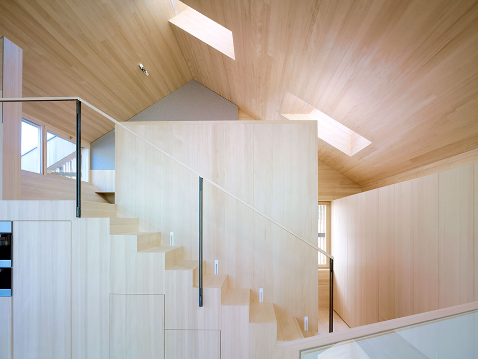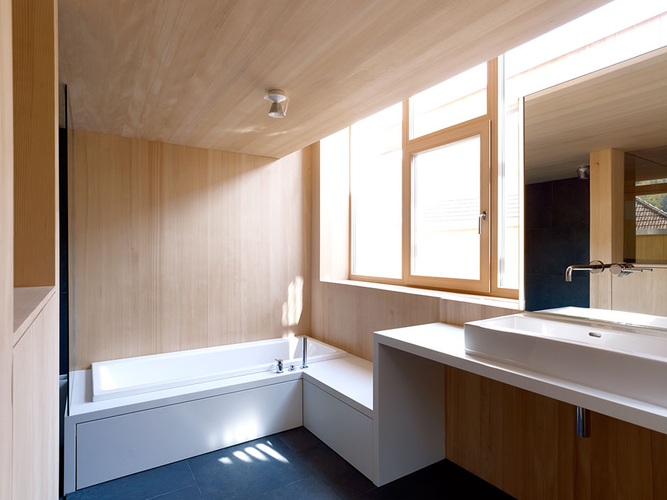 Despite the neighbourhood’s high building density, the House by the Garden of Venus provides ample daylight, privacy and a strong connection to the natural environment. Horizontal ribbon windows on the eastern side and strategically placed roof windows on the western side bring light deep into the interior.