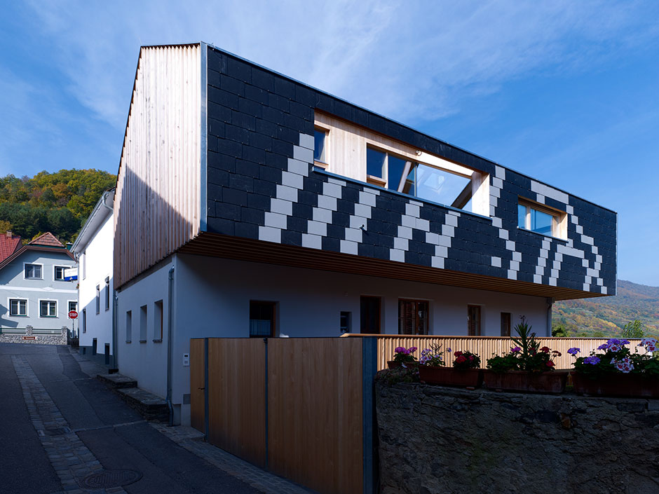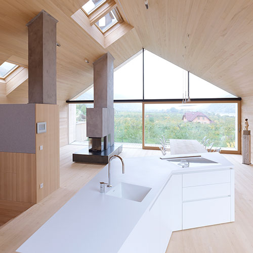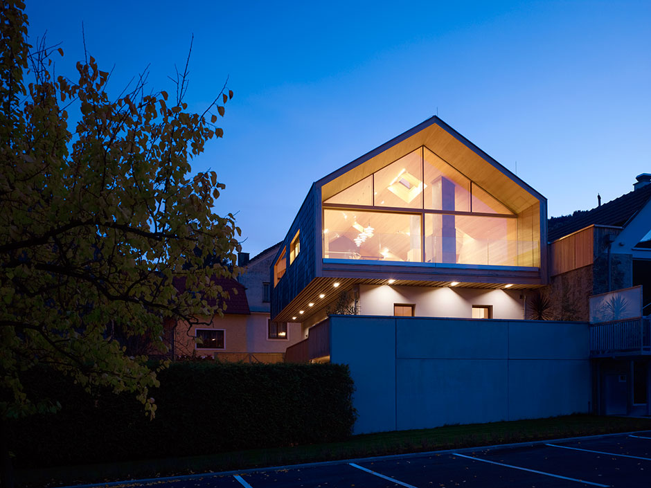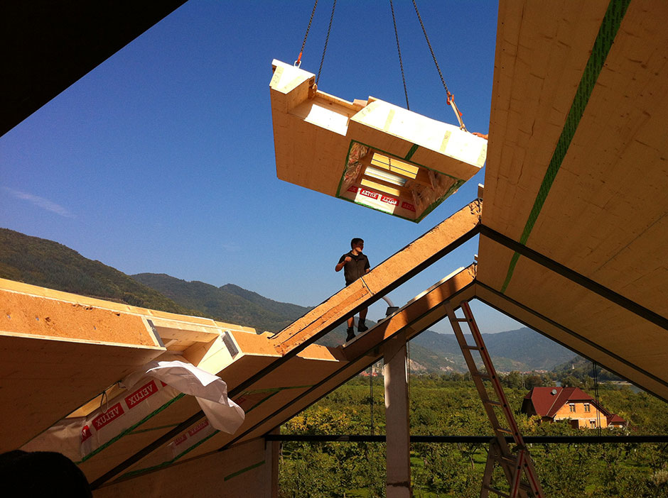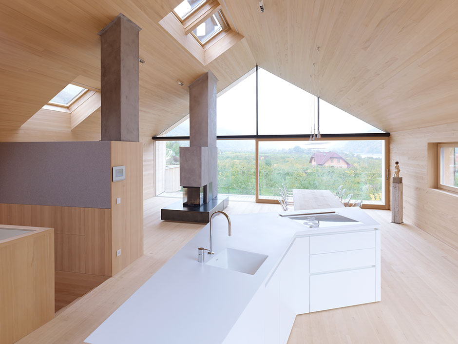 All areas of the top floor are evenly illuminated all year round, even on cloudy days, via the glass gable wall on the northern side, which also provides an uninterrupted view of the apricot orchard and the Danube Valley.