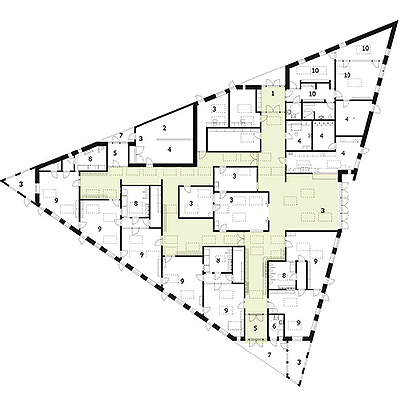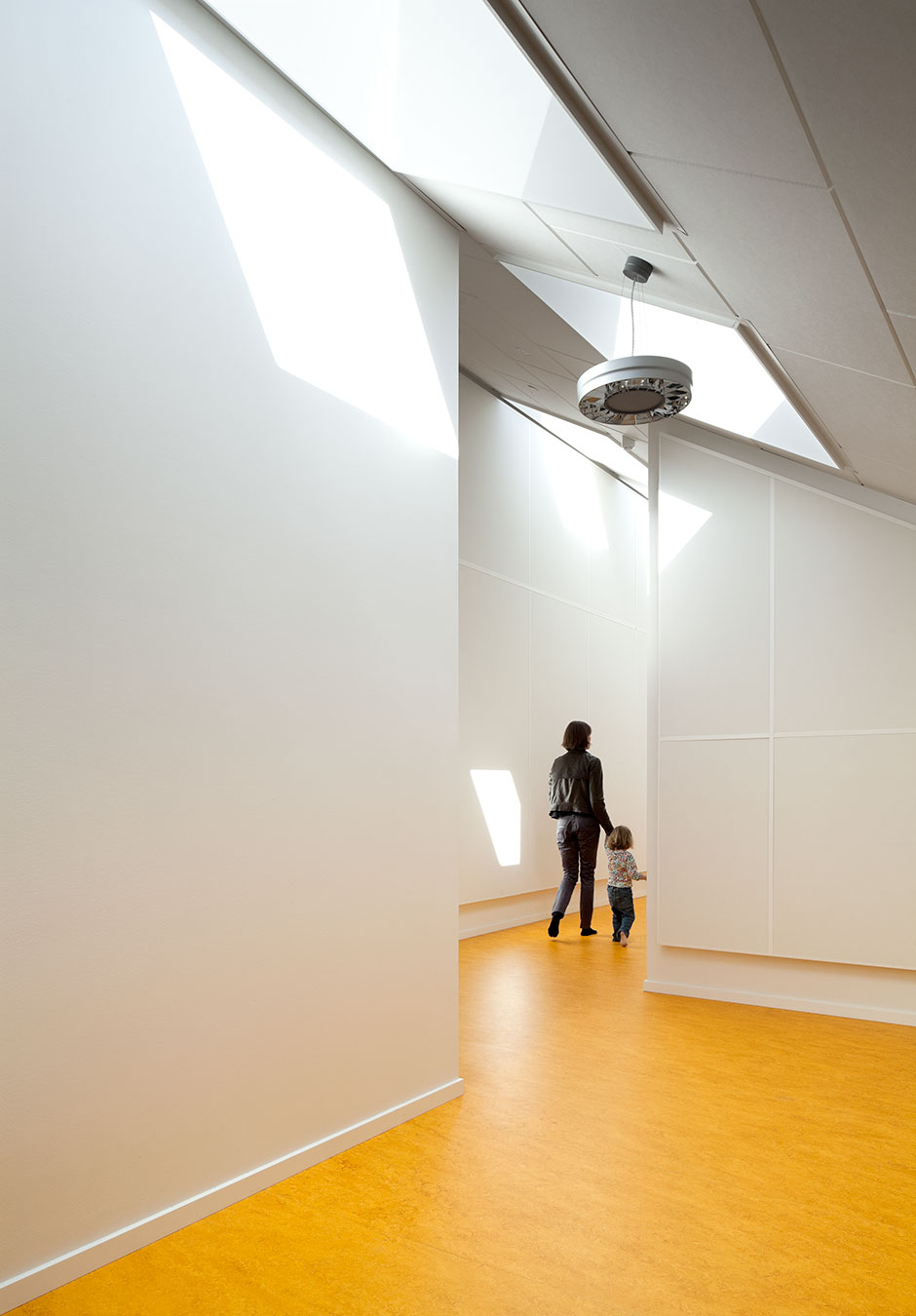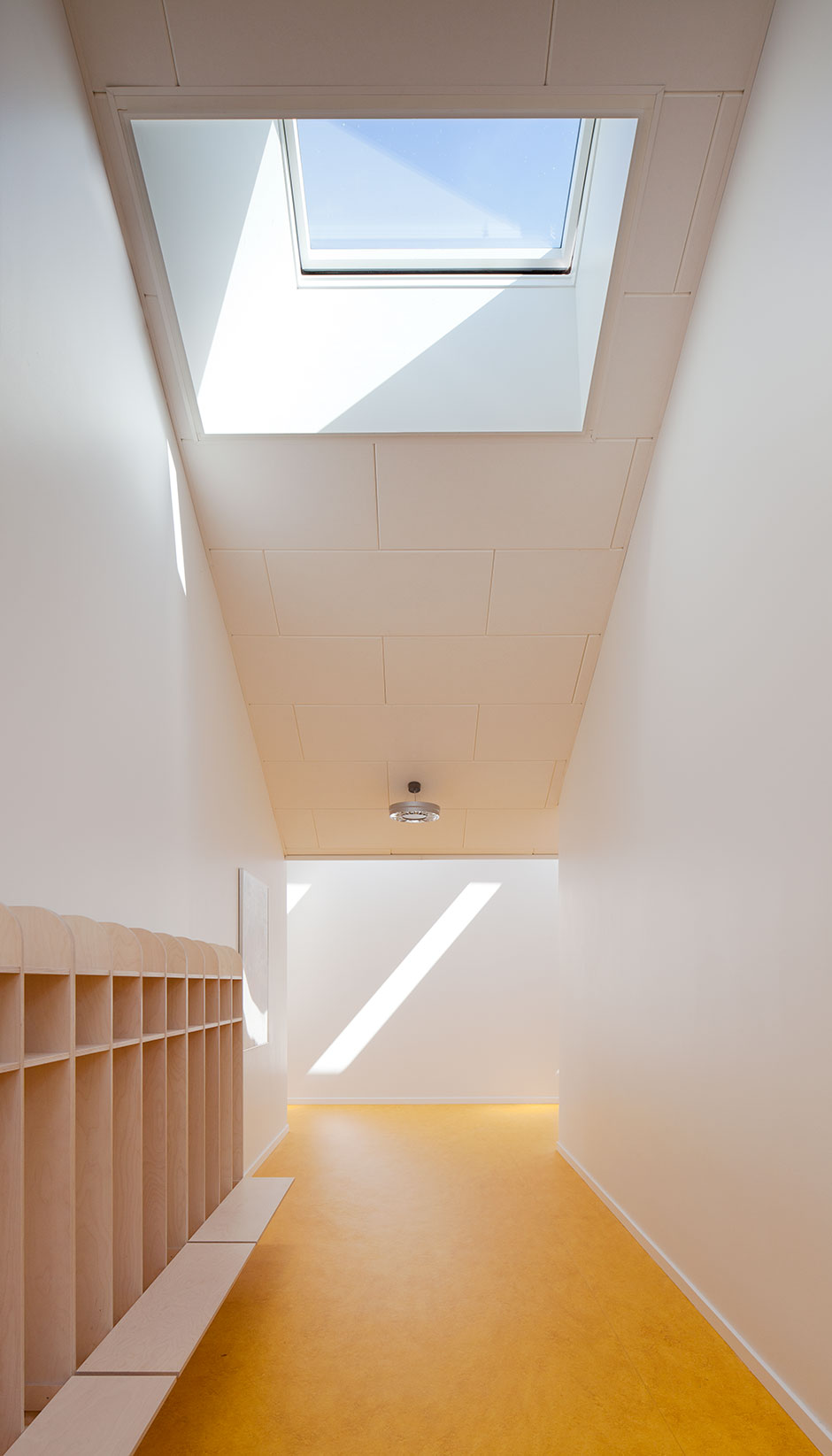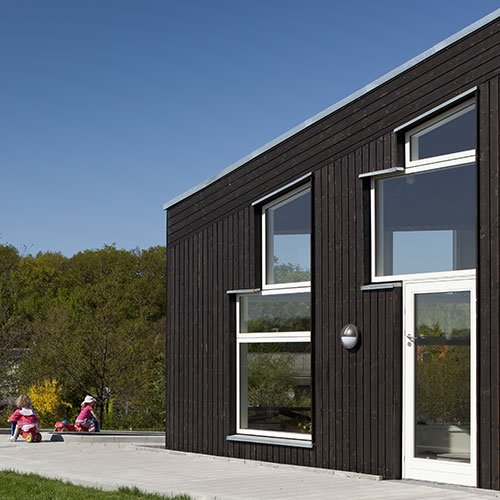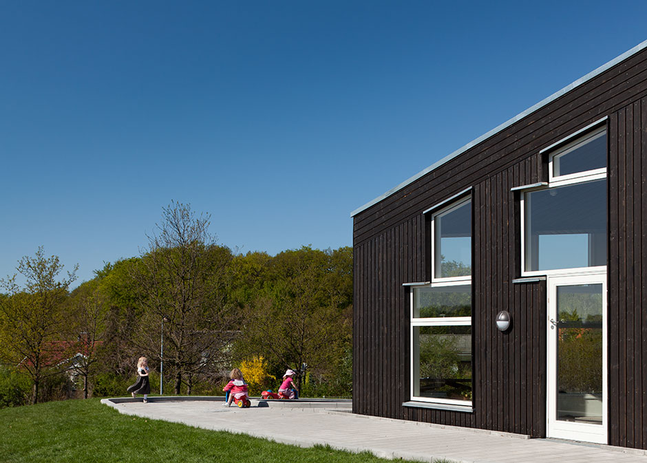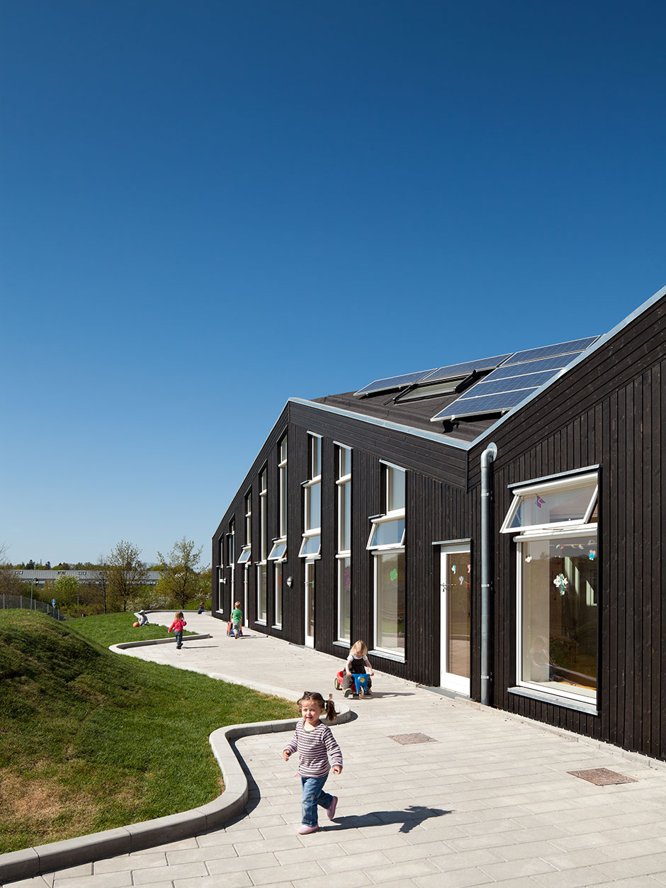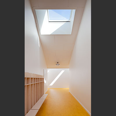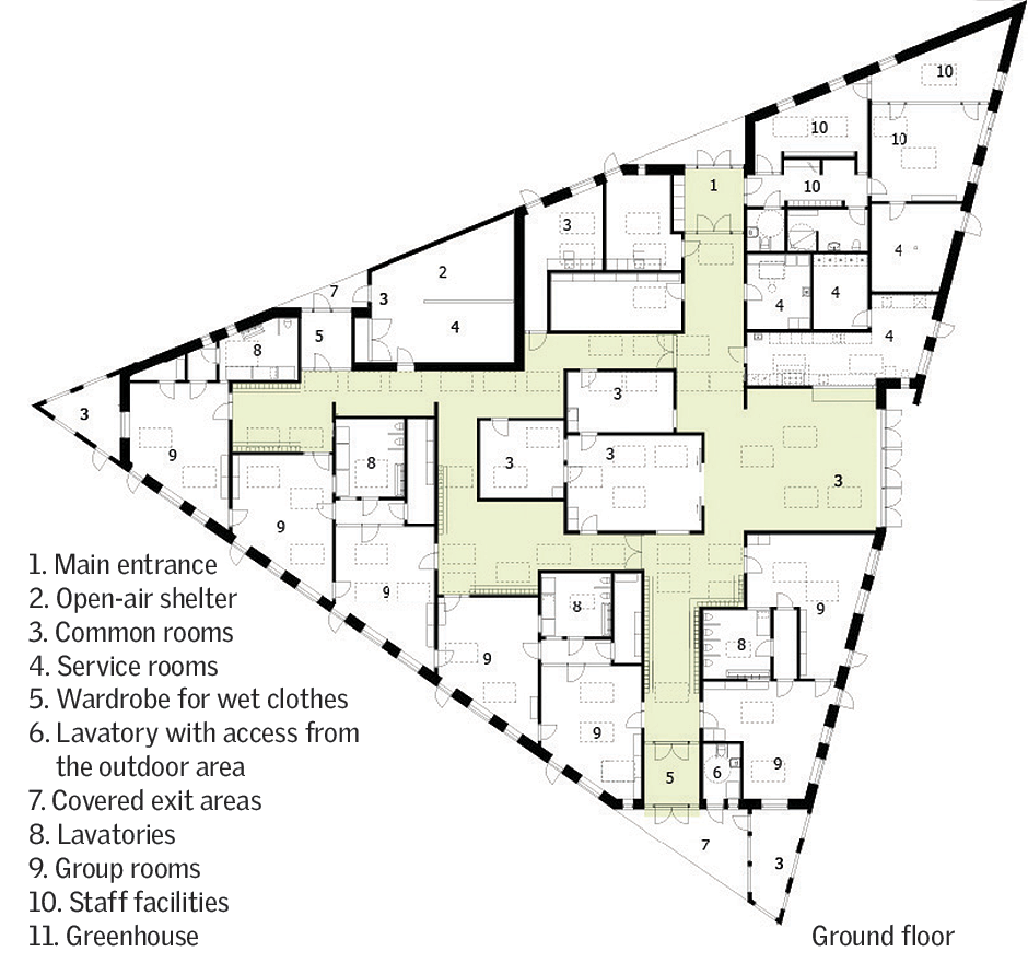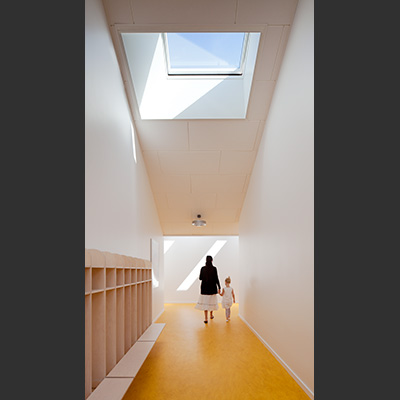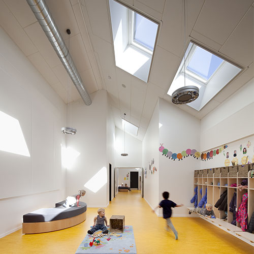 The centre is laid out as a small village, with streets, lanes, small squares and niches, and divided into three zones: an arrival zone; a small children’s zone with access to group rooms, an outdoor area and an open-air shelter; and a large children’s zone with access to group rooms and the outdoor area. Common exercise rooms and eating facilities are situated in the middle of the building for easy access.