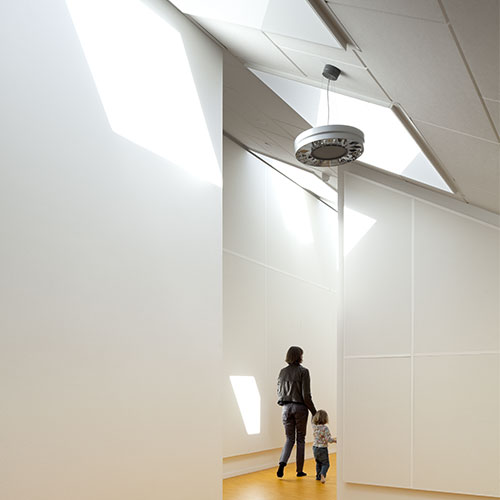 Inside the centre, the special design and volume of the rooms, together with the use of sound absorbers, ensure a good acoustic climate.