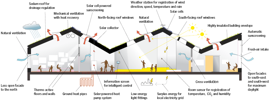 The weather station on the roof and the temperature and CO2 sensors in every room ensure a good indoor climate, protecting against overheating, ventilating with fresh air, and switching the lights on and off according to requirements and weather conditions. They also help save energy.