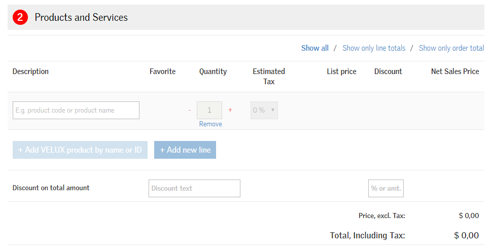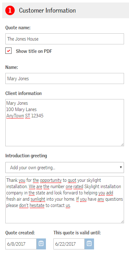 For the quote itself, you can enter information such as greeting, customer address, 'quote created' date and 'valid until' date. After completing this information, just click on 'Save and close quote header'. That will save the information and collapse the Customer Information section.